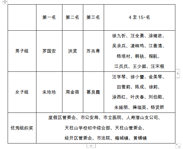 本次活動分設(shè)男子組、女子組。經(jīng)過激烈比拼,羅國安、朱玲玲分獲男女第一名;洪濱、周金苗分獲男女第二名;蘇兆青、葛良霞分獲男女第三名;度假區(qū)管委會等10個單位獲優(yōu)秀組織獎。