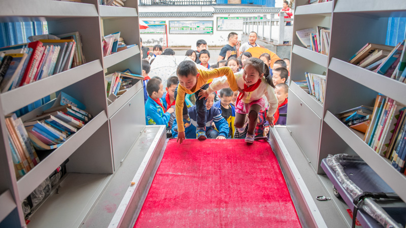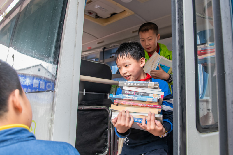 學生們依次排好隊伍,工作人員組織他們到流動圖書車上參觀學習,當看到自己喜愛的書籍時,孩子們不禁歡呼雀躍,有的坐下來津津有味地閱讀,有的則站在一旁靜靜地翻閱,沉浸在知識的海洋里。