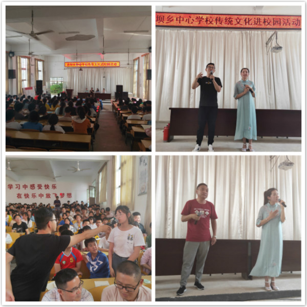 活動(dòng)邀請(qǐng)潛山市戲劇團(tuán)藝術(shù)家們來(lái)校與師生共同交流聯(lián)歡。市劇團(tuán)負(fù)責(zé)人向全體師生普及了黃梅戲知識(shí),從我國(guó)的五大劇種到黃梅戲的唱念做打基本功,其間穿插演員們的精彩演示,尤其是最后環(huán)節(jié)男女演員教唱《夫妻雙雙把家還》,全體同學(xué)分角色學(xué)習(xí)、演唱,學(xué)校老師、同學(xué)與演員精彩對(duì)唱把活動(dòng)推向高潮。