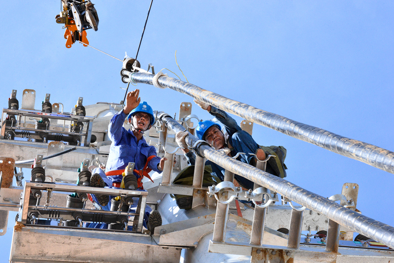 8月1日5時30分,在黃鋪鎮(zhèn)古井村鴨子包山岡上,潛山供電公司員工唐滿紅、葛立斌趁著清晨的一絲涼意,攀爬上10千伏中河雙回線001號桿塔上,將兩根碗口粗的電纜吊裝到16米高的鐵塔上,為緩解黃泥鎮(zhèn)迎峰度夏供電壓力緊張施工。