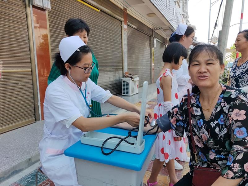 小分隊(duì)走進(jìn)油壩鄉(xiāng)衛(wèi)生院,與值班醫(yī)生、護(hù)士進(jìn)行面對面的學(xué)習(xí)和交流,了解農(nóng)村醫(yī)療現(xiàn)狀,學(xué)習(xí)相關(guān)知識技能,探討護(hù)理行業(yè)的現(xiàn)狀與發(fā)展前景。隨后在油壩鄉(xiāng)街道開展了義診活動,志愿者們攜帶儀器,搭建義診臺,詳細(xì)解答居民的咨詢,為每一位咨詢者測量血壓,告知他們平時生活中應(yīng)該注意的健康問題,建議清淡飲食適當(dāng)鍛煉等,讓他們學(xué)會正確的控制血壓。志愿者們還現(xiàn)場模擬教學(xué)溺水的急救措施CPR(心肺復(fù)蘇術(shù)),一邊講解一邊教學(xué)操作,教會大家急救措施的要領(lǐng),同時演示了海姆立克急救法,指導(dǎo)居民如何在小孩和成人發(fā)生噎食時進(jìn)行急救,糾正了以往一些錯誤的做法。