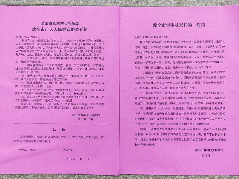 學(xué)校利用教職工會議、學(xué)生聚會向全體師生提醒用電用火安全,尤其是不要在野外使用明火,向每一位同學(xué)發(fā)放《潛山市森林防火指揮部致全市廣大人民群眾的公開信》,班主任分別在班上進(jìn)行學(xué)習(xí)和宣傳發(fā)動,要求每一位同學(xué)將回執(zhí)家長簽字確認(rèn)后帶回學(xué)校存檔,同時利用家長接送孩子間隙,向各位家長發(fā)放《致全市學(xué)生及家長的一封信》,讓更多的市民知曉并參與森林防火工作。
