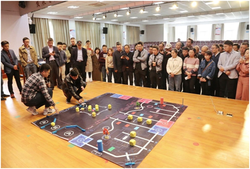 培訓(xùn)會上,安徽樂創(chuàng)教育科技有限公司為18所實(shí)驗(yàn)學(xué)校捐贈了相關(guān)設(shè)備并為大家培訓(xùn)了機(jī)器人“守護(hù)家園”活動的比賽規(guī)則、場地搭建、器材組裝、程序代碼編寫等內(nèi)容,進(jìn)行了現(xiàn)場演示。隨后,所有參訓(xùn)老師分組上臺進(jìn)行了實(shí)踐演練。
