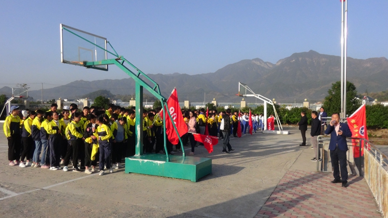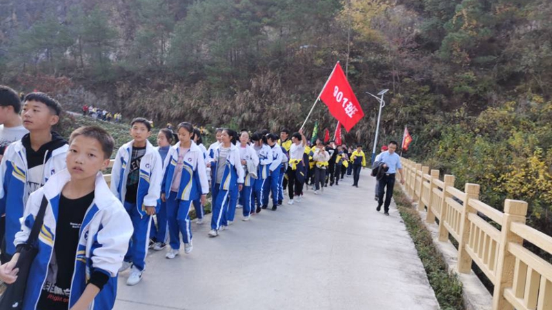 一路上,同學(xué)們高舉紅旗,精神抖擻,步伐整齊。在巍峨的大山懷抱里,在清脆的樹蔭下,綿延的隊伍猶如一條長龍,點綴著這美麗的鄉(xiāng)村。