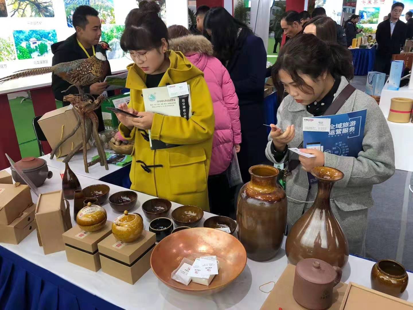 潛山展區(qū)裝扮一新,猶如仙境,美輪美奐的天柱山景區(qū)圖片引人注目。展區(qū)內(nèi)工作人員發(fā)放宣傳資料、展示特色文化旅游商品,千年痘姆古陶、糯米原汁封缸酒、地域特色的官莊豆皮等旅游產(chǎn)品吸引眾多游客前來(lái)購(gòu)買(mǎi),并進(jìn)行業(yè)務(wù)洽談。