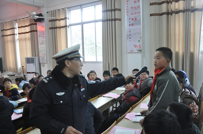 潘小五六年級(jí)師生全員參與?;顒?dòng)中,交警大隊(duì)警官向全體師生進(jìn)行了交通安全知識(shí)教育,他運(yùn)用多媒體課件及圖片對(duì)相關(guān)交通法規(guī)進(jìn)行了詮釋,并深入學(xué)生中間進(jìn)行了互動(dòng)。