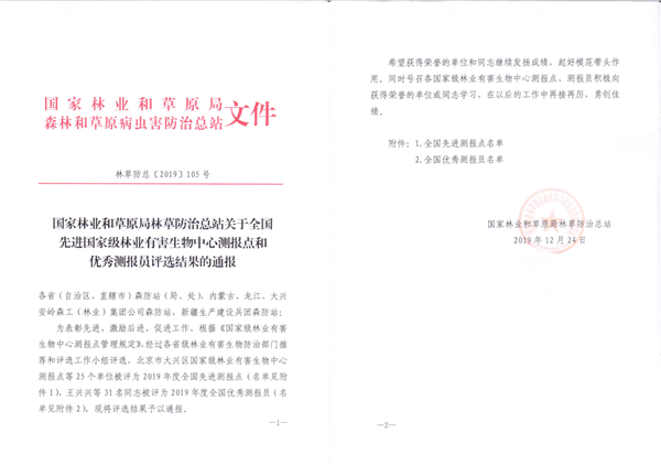 為表彰先進、激勵后進、促進工作,國家林業(yè)和草原局林草防治總站根據(jù)《 國家級林業(yè)有害生物中心測報點管理規(guī)定》,經(jīng)過各省級林業(yè)有害生物防治部門推薦和評選工作小組評選,北京市太興區(qū)國家級林業(yè)有害生物中心測報點等25個單位被評為2019年度全國先進測報點,王興興等31名 同志被評為2019年度全國優(yōu)秀測報員。
