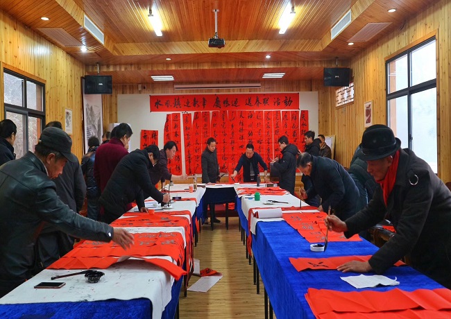 在水吼村寫好100余副對聯(lián)后,書法愛好者們來到臥龍生態(tài)園會(huì)議室,揮毫潑墨,為天柱村村民撰寫對聯(lián)。經(jīng)過大家的共同努力,書法愛好者們共創(chuàng)作出200多幅對聯(lián),送給當(dāng)?shù)氐拇迕?。在天柱村萬山組開農(nóng)家樂和民宿的程革文拿到春聯(lián)后說:“天水路的暢通,每年至少給我這樣的個(gè)體經(jīng)營戶增加30%的收入,路通了,到天柱山和天仙峽景區(qū)的游客更多了,我們的生意也會(huì)越來越紅火。”