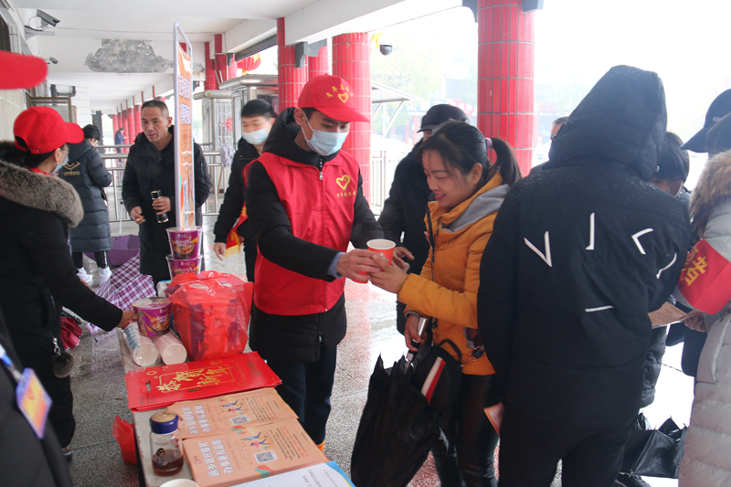 志愿者們?cè)诨疖囌境稣究谠O(shè)置了“暖冬行動(dòng)”服務(wù)站,為來(lái)往的旅客提供熱水、姜茶和口罩,以發(fā)放宣傳單頁(yè)等形式向返鄉(xiāng)旅客宣傳煙花爆竹禁限放政策,號(hào)召大家以安全、環(huán)保、健康的形式歡度新春佳節(jié),營(yíng)造文明生活新風(fēng)尚。