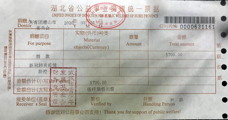 團(tuán)市委了解情況后立即與武漢市青少年發(fā)展基金會(huì)取得聯(lián)系,詳細(xì)咨詢捐贈(zèng)流程,武漢市青少年發(fā)展基金會(huì)負(fù)責(zé)人向潛山青年表達(dá)了衷心的感謝,并表示一定會(huì)將捐款和物資用于最需要的地方,為疫情阻擊戰(zhàn)注入熱烈的青春力量!