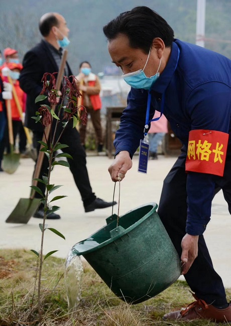 在義務(wù)植樹活動(dòng)現(xiàn)場(chǎng),志愿者干勁十足,有的搬運(yùn)樹苗、有的揮鍬挖坑、有的扶直苗木、有的培土踩實(shí),各個(gè)環(huán)節(jié)有條不紊,配合默契,將一株株樹苗認(rèn)真細(xì)心地種下,同時(shí)也種下了希望,易地搬遷點(diǎn)的部分群眾也自愿參與到活動(dòng)中來(lái),幫助澆水和后續(xù)管理。梅寨村的楊續(xù)斌是水吼鎮(zhèn)“脫貧之星”,也是這次疫情防疫的小區(qū)網(wǎng)格長(zhǎng),看到志愿者們熱火朝天的忙碌,他自愿加入到隊(duì)伍中給苗木澆水,并表態(tài)后期要帶領(lǐng)其他人做好苗木后續(xù)管理工作。
