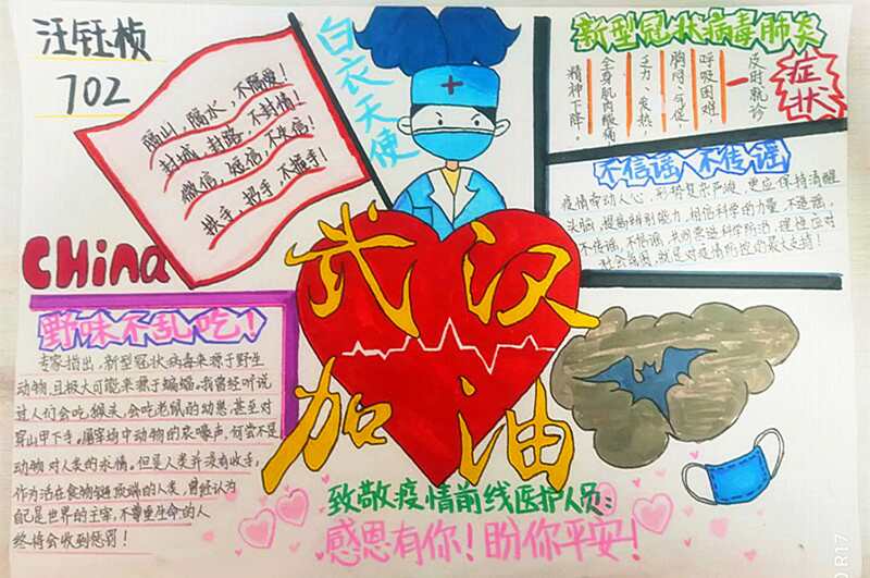組織七年級同學(xué)開展以“爭當(dāng)防疫小衛(wèi)士”為主題的海報設(shè)計活動。同學(xué)們用手中的畫筆,描繪出“新冠”病毒和心中的英雄;用文字詮釋了各種抗擊病毒的小妙招。