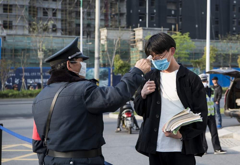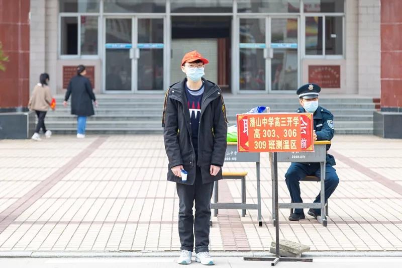 在野寨中學(xué),教職工和學(xué)生志愿者上午6點半就開始到崗,保障高三學(xué)生開學(xué)復(fù)課工作,所有學(xué)生通過“紅外線測溫儀”檢測體溫才能進(jìn)入學(xué)校。