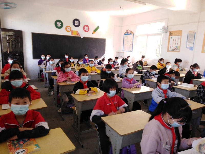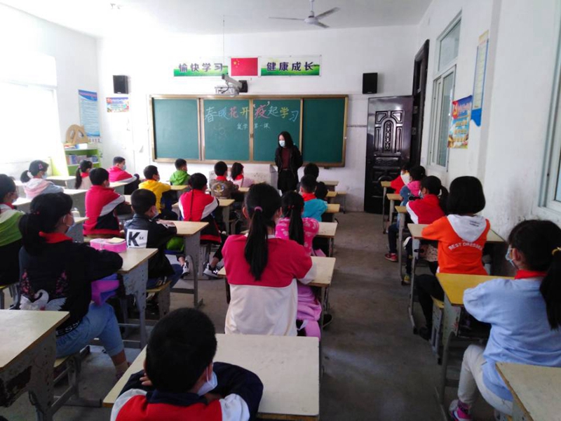 學校行政人員和四五六年級授課老師早早地來到學校,進入維持秩序、測量體溫、消毒洗手、更換口罩等工作崗位,等待返校學生的歸來。學校實行錯峰報到,四五六年級學生分三批進入校園報名。八時許,學生背著書包,面帶微笑,精神煥發(fā),站在健康隔離線位置排隊,有序進入校園,測體溫,登記信息,洗手消毒,更換新口罩,按照路線進入教室,簽承諾書,填健康信息。報名、發(fā)書以后,各班上“復學第一課”對學生進行愛國主義教育和生命健康教育,宣傳校內(nèi)疫情防控要求。隨后,按課程表上課,學生中午在校錯時就餐,下午放學錯峰離校。