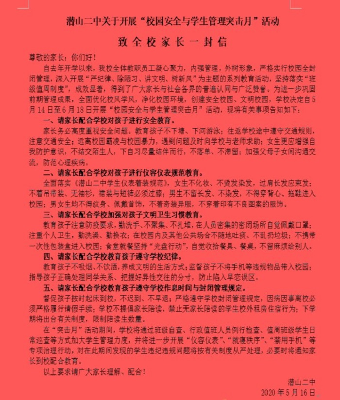 潛山二中從去年下學(xué)期以來(lái),內(nèi)強(qiáng)管理,外樹(shù)形象,相繼開(kāi)展了“校園封閉管理”、“除校園四害”、“嚴(yán)紀(jì)律、去陋習(xí)、樹(shù)新風(fēng)”等一系列教育活動(dòng),取得了良好的管理效果與社會(huì)反響。該校希望借助此次活動(dòng)讓全體同學(xué)在增強(qiáng)安全防范意識(shí)、養(yǎng)成良好行為習(xí)慣、遵守校紀(jì)班規(guī)等方面更上新臺(tái)階,進(jìn)一步提升學(xué)校的管理水平與辦學(xué)質(zhì)量。