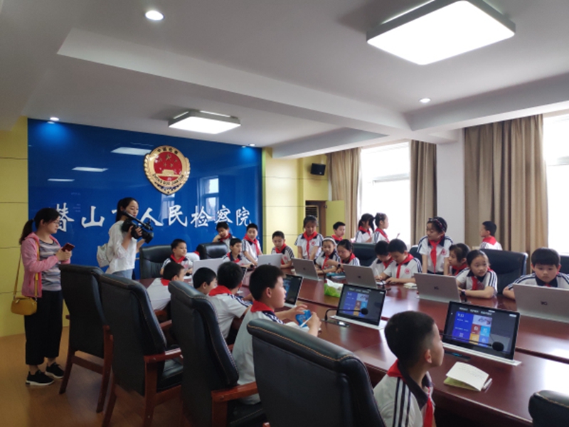 在工作人員的帶領(lǐng)下,學(xué)生們依次參觀了檢察院案管大廳、電子卷宗制作室、遠(yuǎn)程提審?fù)徥摇⑦h(yuǎn)程信訪接待室等檢務(wù)工作區(qū)。檢察院還專門聘請(qǐng)了援鄂歸來(lái)的潛山市市立醫(yī)院、中醫(yī)院的三位醫(yī)務(wù)工作者,為學(xué)生講述了去武漢疫情一線的抗疫故事;檢察院宣傳科根據(jù)《預(yù)防未成年人犯罪法》的相關(guān)內(nèi)容,安排檢察官為孩子們上了一堂“抵制不良行為,加強(qiáng)防范意識(shí)”的法制宣傳課,讓孩子們了解相關(guān)法律規(guī)定、如何學(xué)會(huì)自我保護(hù)、自覺(jué)做到遵法守法。