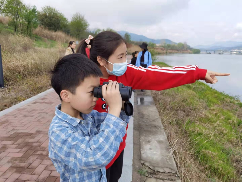 在潛山的秋季,觀看濕地公園潛河里的動植物成為當?shù)睾⑼钕矚g的自然科普課堂。“同學(xué)們,你們可以借助手里的望遠鏡,看河岸邊柳樹上站立的鳥兒,它名叫白頭鵯,又叫白頭翁,這是一只雄鳥,胸部灰色較深,如果是雌鳥,胸部顏色要淺淡,雄鳥的后頭部白色極為清晰醒目。”來自安慶師范學(xué)院的趙凱教授是一名專業(yè)的講解員,也是一名志愿者,應(yīng)天柱山世界地質(zhì)公園和潛山市圖書館的邀請,他每年都會常態(tài)化帶領(lǐng)當?shù)氐?ldquo;觀鳥團”觀看鳥類。